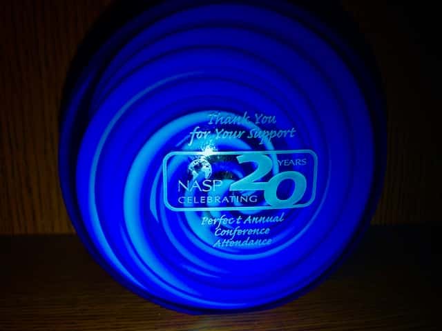 At the Sunday night reception, NASP President Kevin DeGarmo presented RMI partners Glenna Roberts and David Matejczyk with 20 year perfect attendance awards. Dave was the conference chair at the inaugural (and two subsequent) NASP Annual Conferences. Both are past board members of the organization.