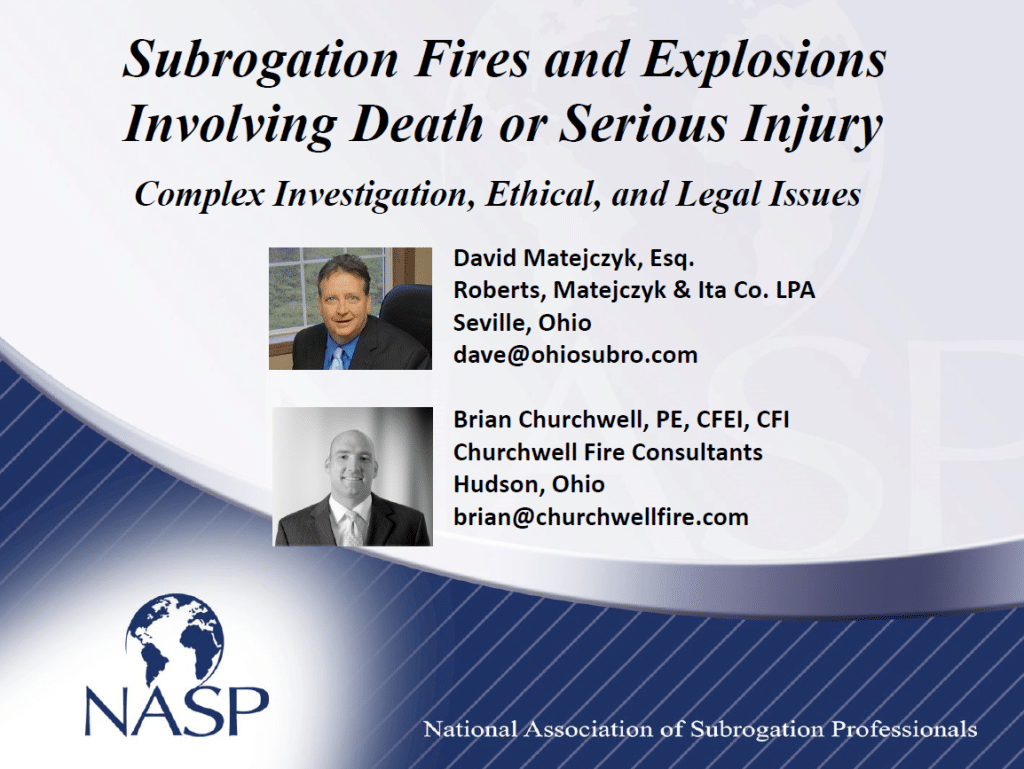 RMI Partner David Matejczyk along with Brian Churchwell, PE, CFEI, CFI of Churchwell Fire Consultants were co-presenters on the topic of Subrogation Fires and Explosions Involving Death or Serious Injury at this past month's NASP Litigation Skills Conference held in Palm Springs, California. During their respective careers, both presenters have been involved in numerous fire and explosion investigations with a death or serious injury component.